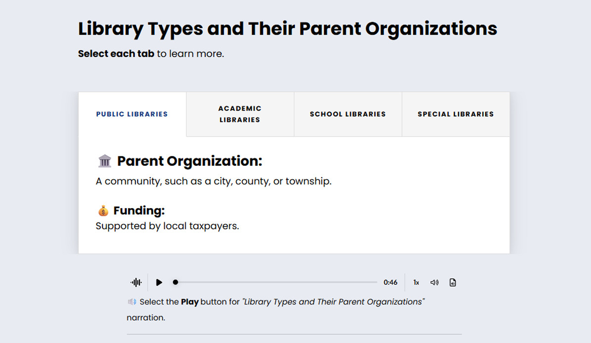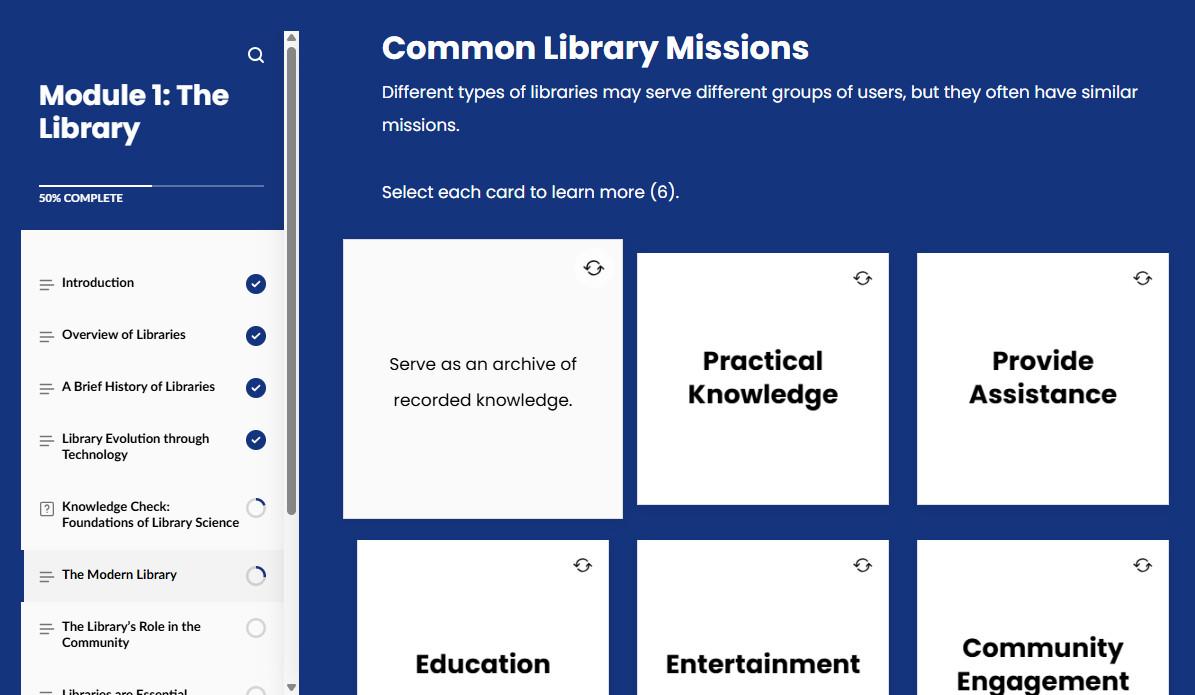 The programs include six courses you can complete at your own pace, on your own time. You’ll complete one core course covering the foundational elements of library service or management and choose from a variety of elective courses that deepen your knowledge and refine your skills in key areas.